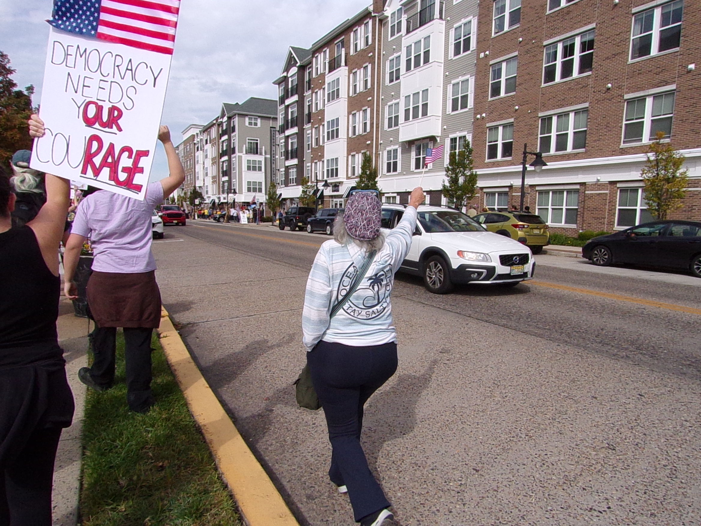 It would have taken a lot indeed to stop the crowd assembled alongside Haddonfield-Berlin Road, marching on either side of the street, chanting slogans, and carrying all manner of signage that spoke to their cause. All of them, from older protestors in costumes to young people there with families, said they were there to call attention to what they perceived as serious problems within and around the Trump presidency, such as his connection to convicted and disgraced financier Jeffrey Epstein.
