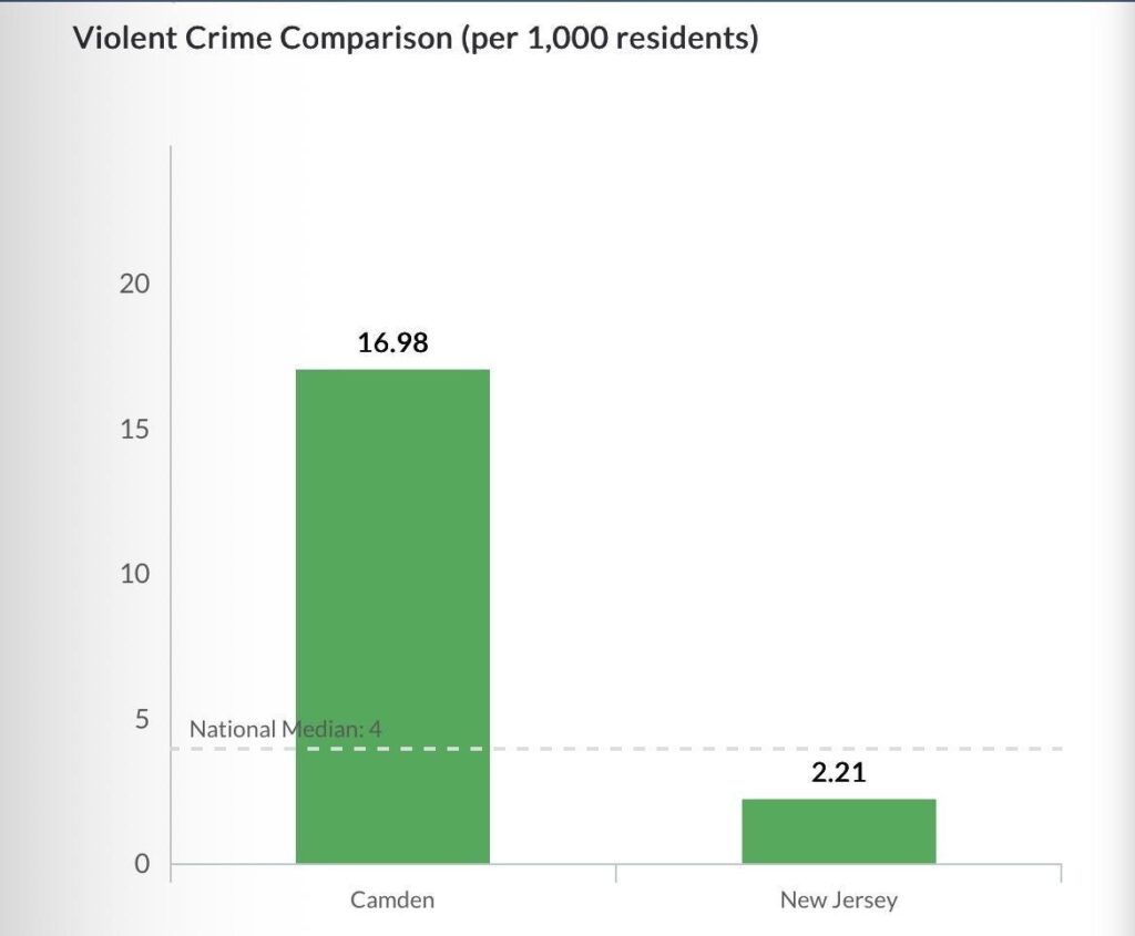 A graph found on neighborhoodscout.com shows violent crimes compared per 1,000 residents. It states that the crime rate for violent crimes within Camden is three times higher than the national median of four. And not only that, it is also six times higher than the average per 1,000 residents in New Jersey as a whole.