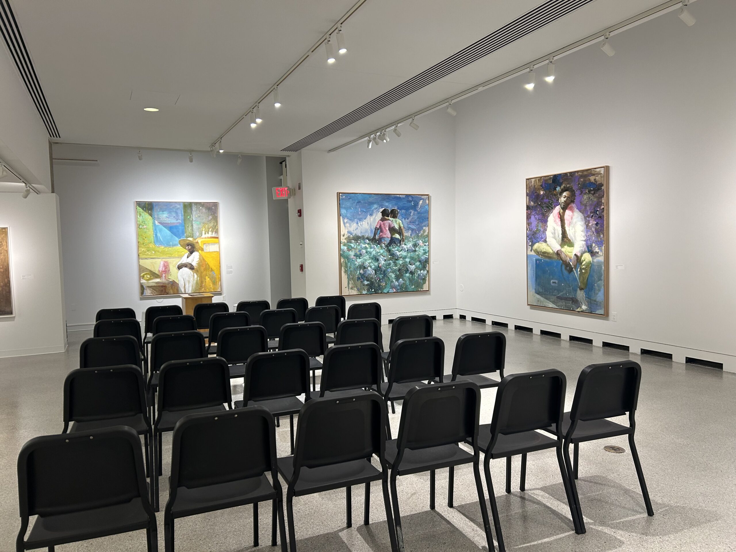 Mykayla, a student employee, described the technical aspects of installation, emphasizing precision and attention to detail: “The installation process was much more technical than I expected. We made sure pieces were hung at eye level, typically five feet at the center, and that measurements were consistent across all artworks.”